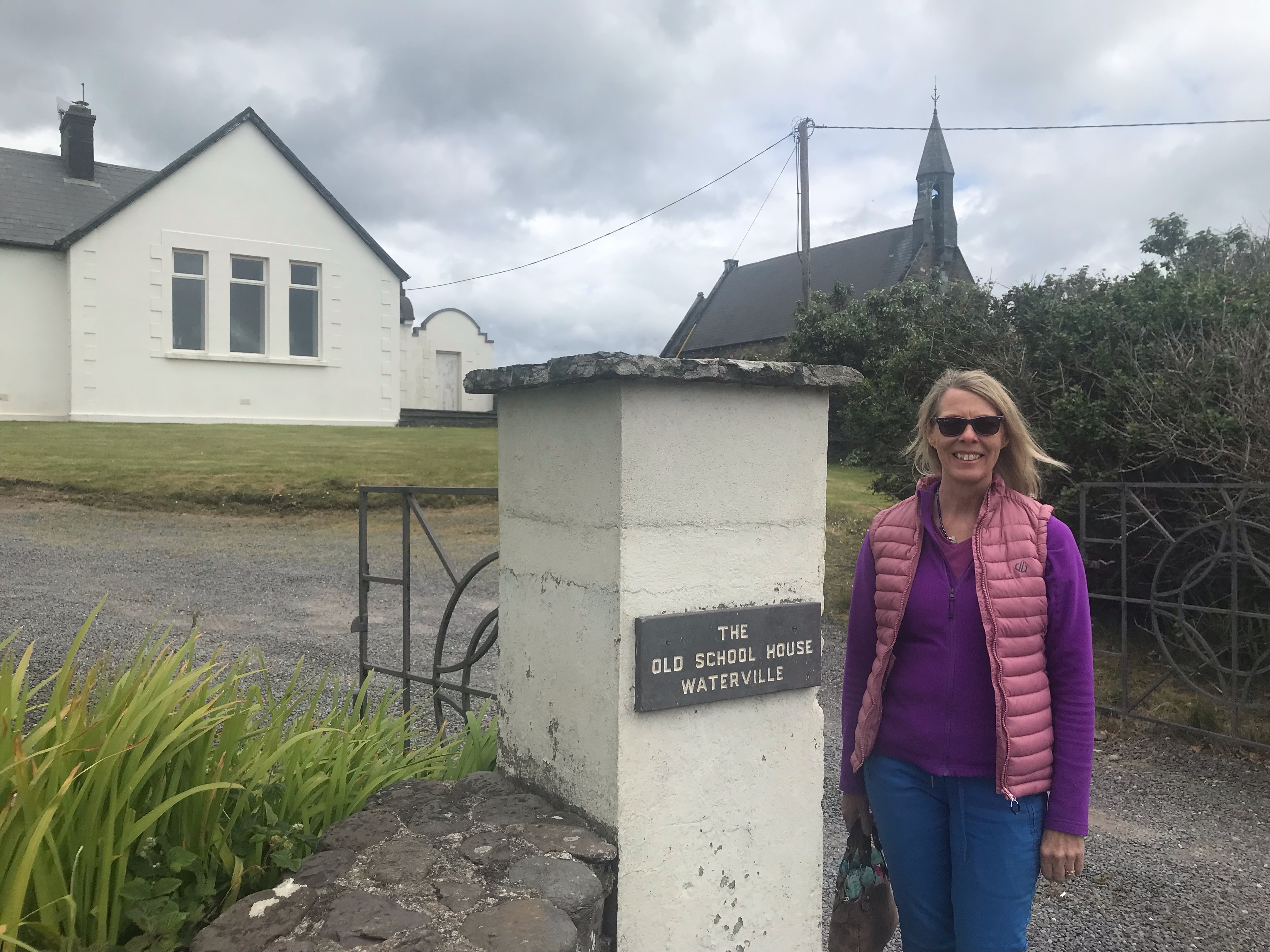 In Waterville we located the house of Su’s Aunt, Sarah Quigley, born in Enniskerry, County Wicklow had trained as a teacher and taught in the local national school. Her husband, Arthur Cullum, worked for the Meteorological Office and the cable station. The cable, from Waterville, stretched some 2,400 miles across the Atlantic and linked Canada with the UK and France. The school is linked to St Michael’s Church of Ireland (which you can see in background below).